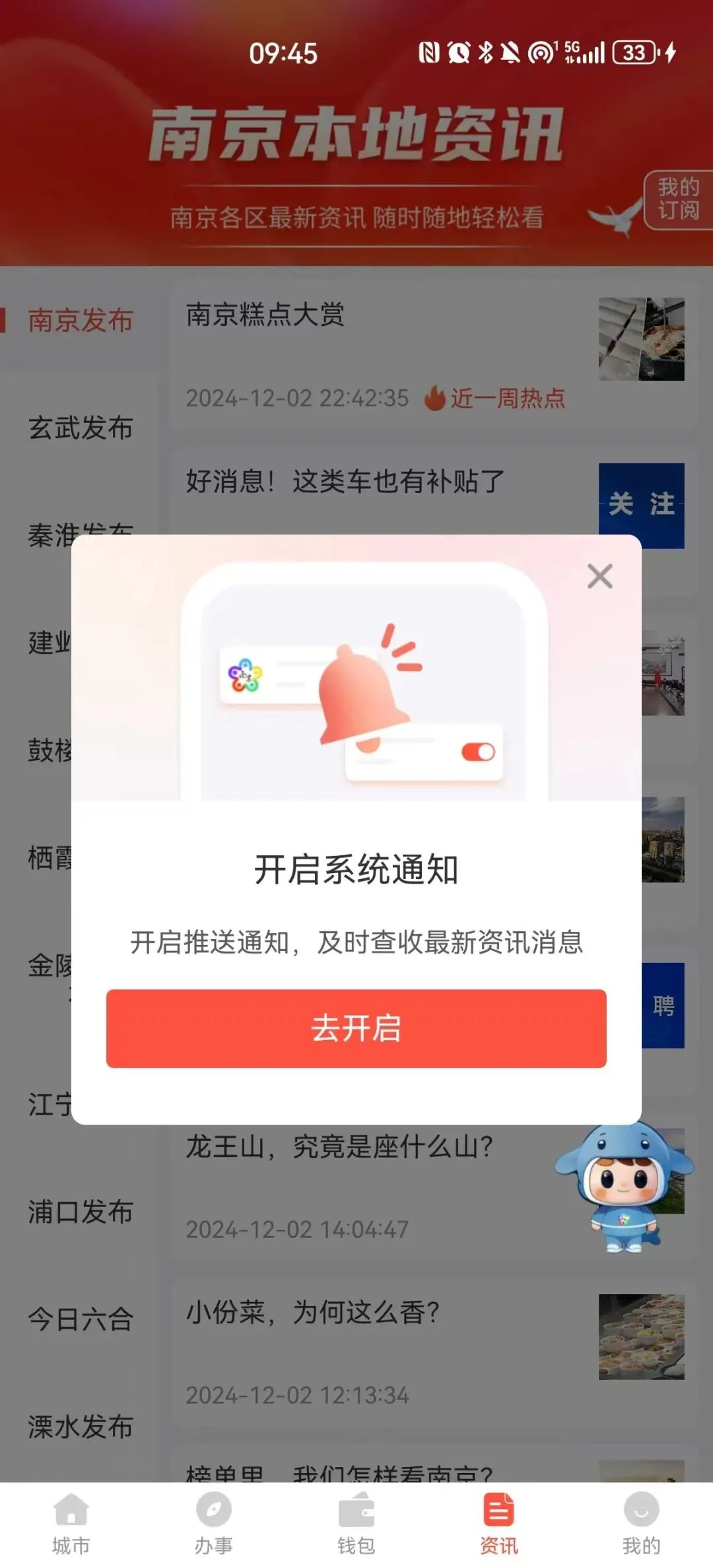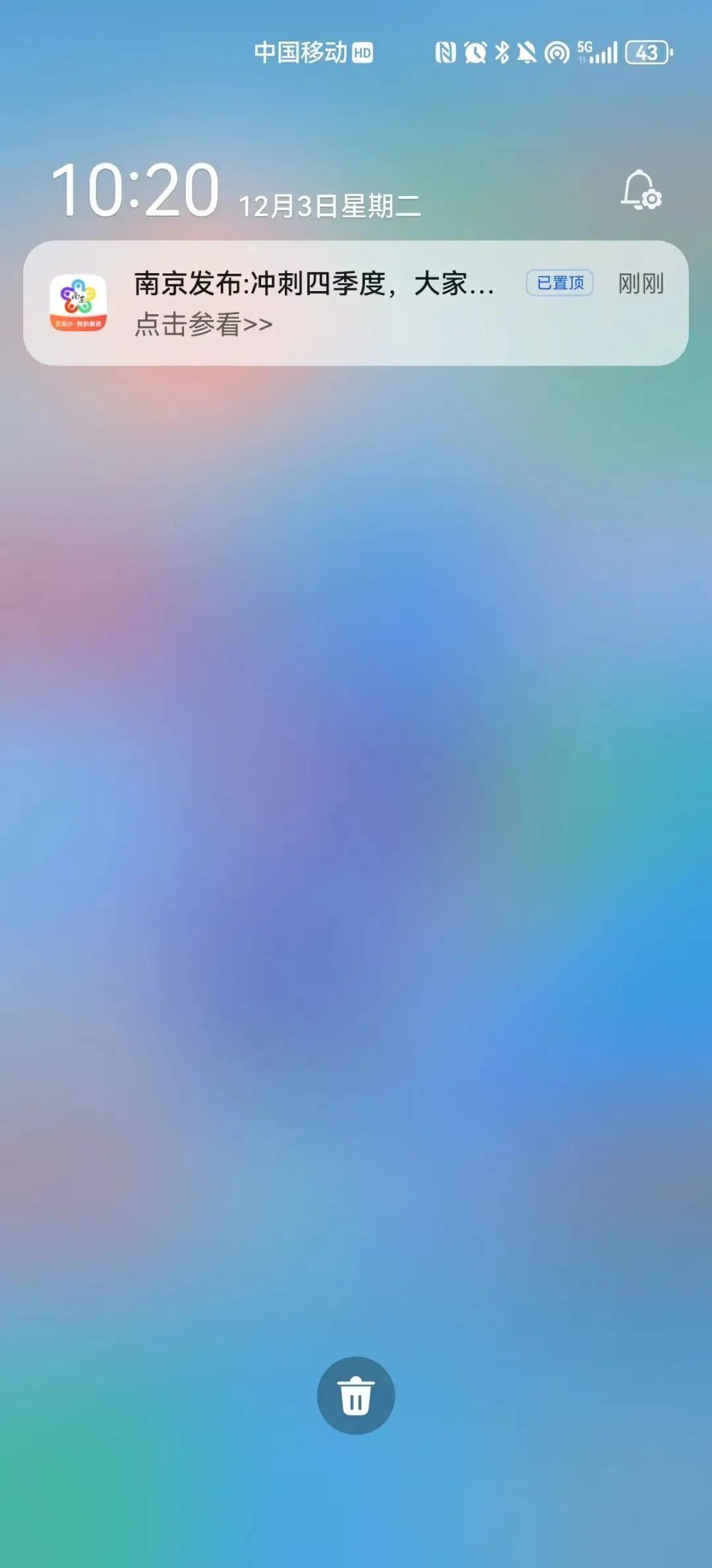 4、訂閱成功后,當(dāng)已訂閱的微信公眾號(hào)資訊內(nèi)容有更新時(shí),用戶即可通過(guò)“我的南京”APP收到本地資訊平臺(tái)推送的消息。