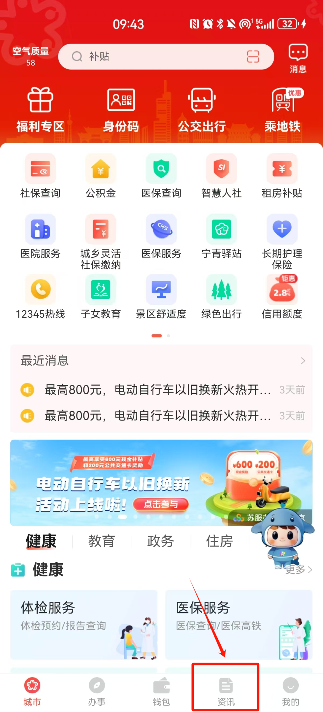 2、點(diǎn)擊APP底部導(dǎo)航欄【資訊】圖標(biāo),即可進(jìn)入南京本地資訊平臺(tái)。