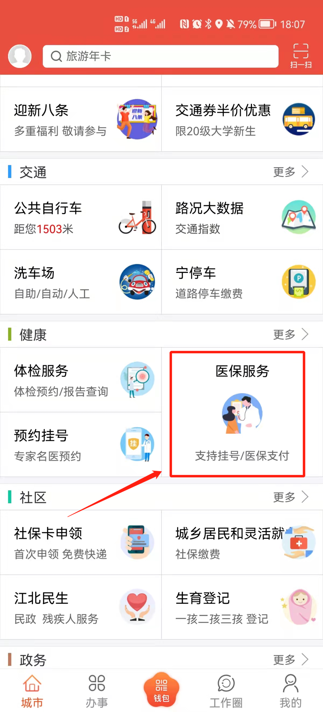第一步:打開“我的南京”APP,點(diǎn)擊首頁“健康模塊-醫(yī)保服務(wù)”按鈕,即可進(jìn)入醫(yī)保服務(wù)頁面。