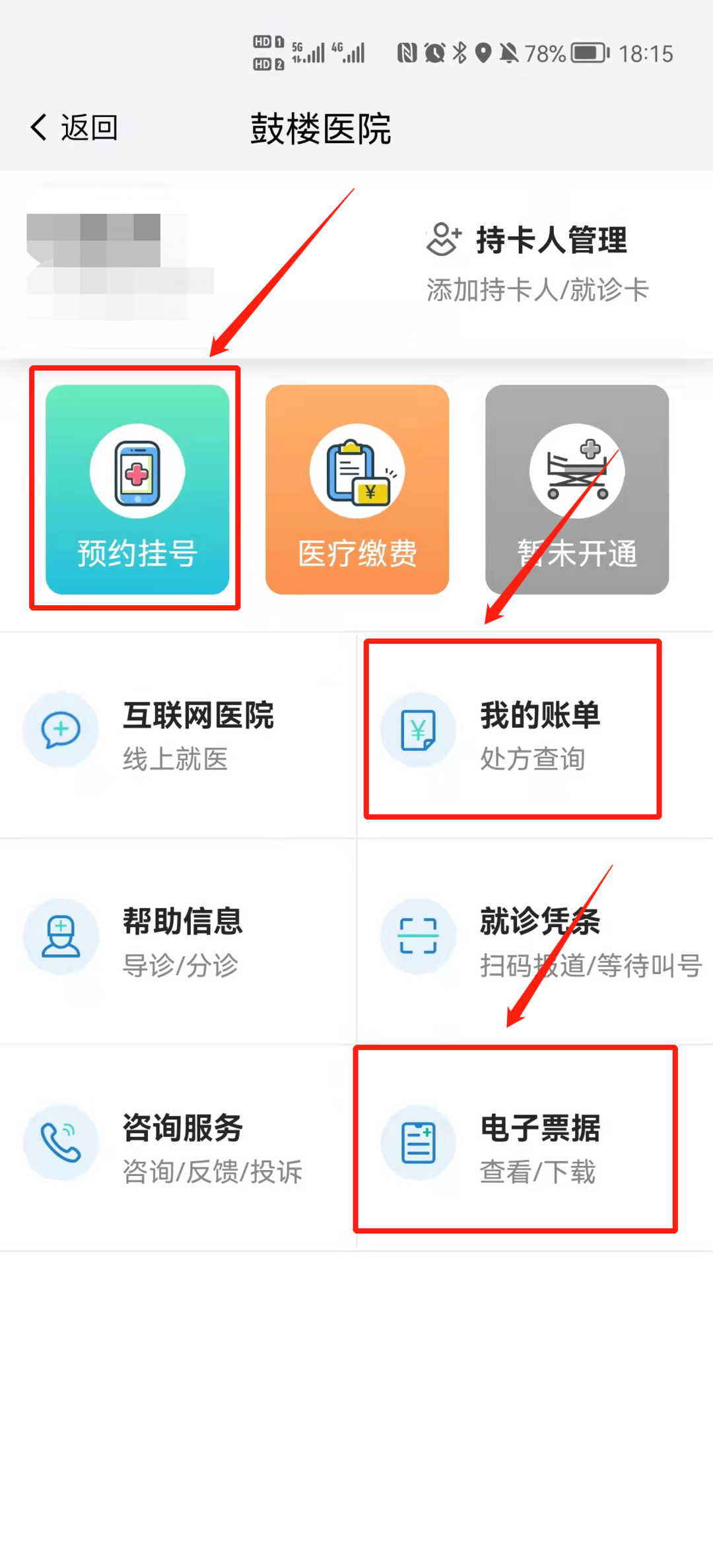 第三步:用戶可根據(jù)自己的需求,點(diǎn)擊相應(yīng)模塊按鈕,進(jìn)行在線預(yù)約掛號、報告處方查詢、電子票據(jù)查看等操作。