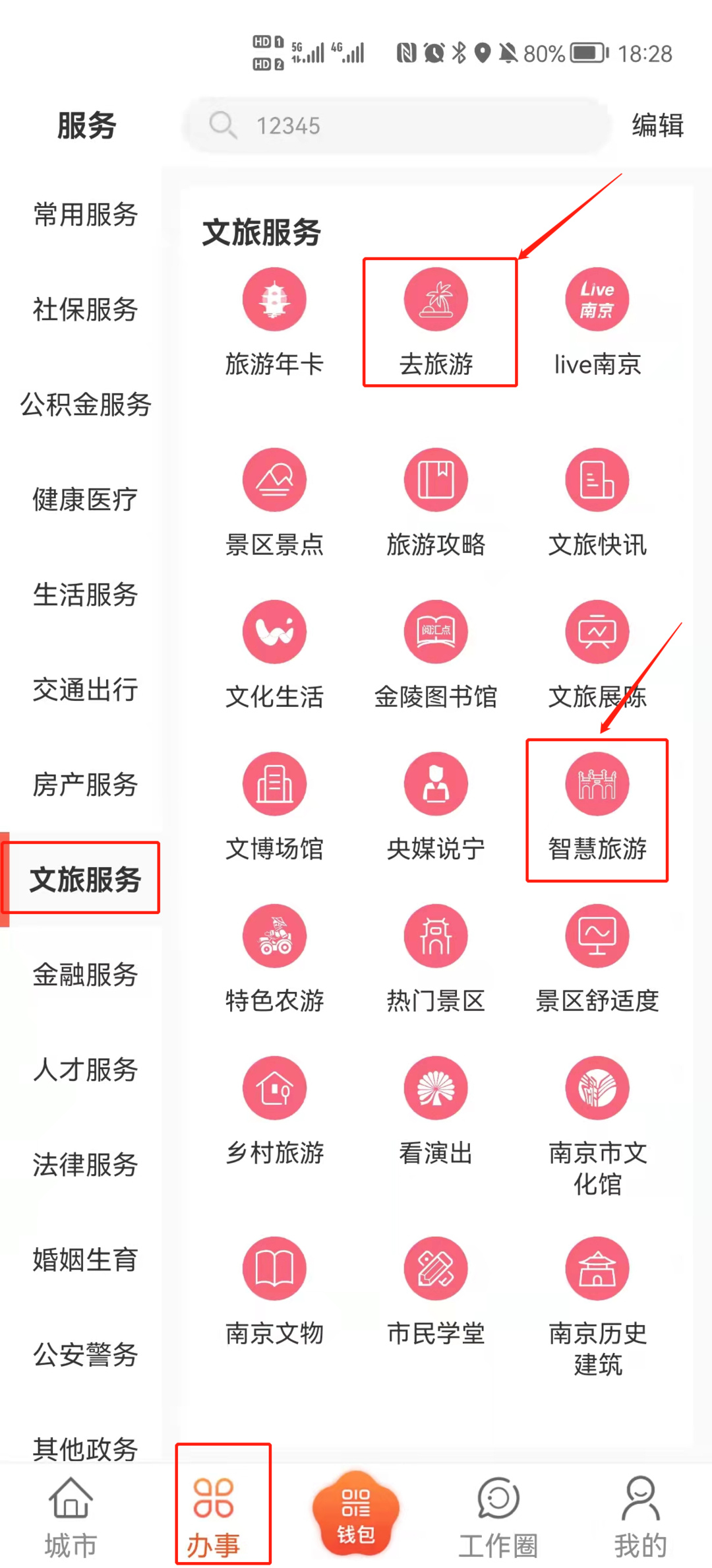 打開“我的南京”APP,點擊辦事頁-文旅服務板塊,即可根據(jù)自己需要選擇去旅游、智慧旅游等應用服務即可。
